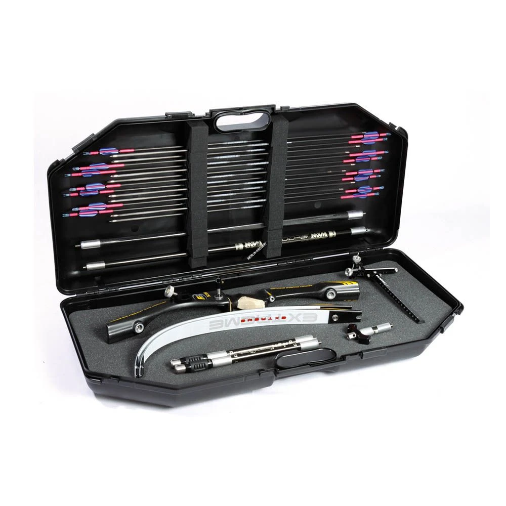 Hard plastic case for recurve bow including arrow compartment in the top lid and wheels for easy transport.